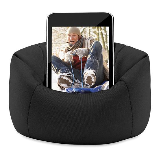 Suportul pentru telefon are aspectul unui fotoliu si este confectionat din poliester.