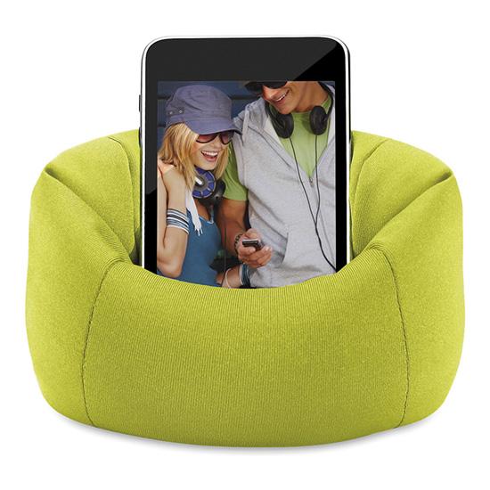 Suportul pentru telefon are aspectul unui fotoliu si este confectionat din poliester.